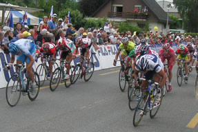We left the hotel in Neuchâtel and drove about 65 km to the Stage 4 finishing town of Bätterkinden. We parked near the finish-line of this very small town. We headed out on the bike and rode the 30 km finishing circuit. It included a very steep Cat-4 climb 5.6 km from the finish. We thought a rider like Paolo Bettini would break away on this hill. He tried, but was caught. We rode another 20 km then settled in to watch the finish. Aussie Robbie McEwen won the stage after Fassa Bortolo's Francesco Chicchi raised his arms thinking he had won. After watching the finish, we drove 80 km to Interlaken where we would spend three nights.